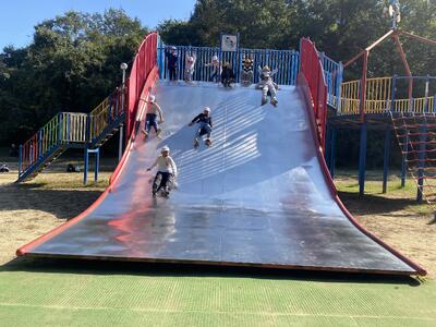 最初に、3・4年生が一緒の班になってオリエンテーリングをし、ゴールを目指しました。道に迷いながらも、班のメンバーでお互いに優しい声をかけ合う姿がたくさん見られ、どの班も無事ゴールすることができました。次に、おいしいお弁当とおやつを食べて、最後に、やんちゃの里エリアのいろんな遊具で思いっきり遊び、全力で楽しみました。