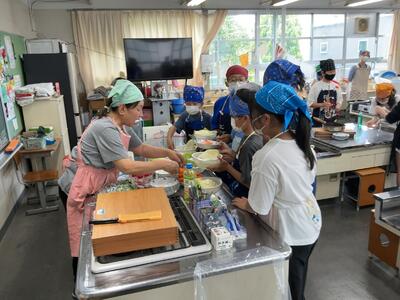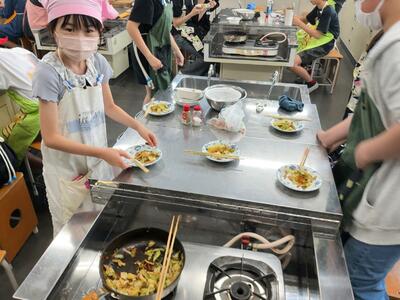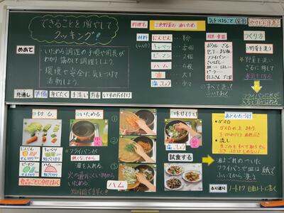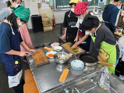 今日は、6年生が家庭科の調理実習で野菜炒めを作りました。説明の後、班で協力しながら「このピーマンはどう切る?」「キャベツの大きさはこれくらいかな。」 最後はどの班も上手にでき、おいしくいただきました。